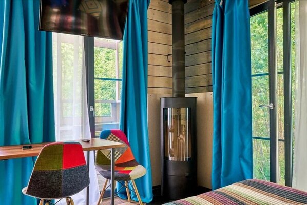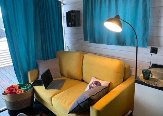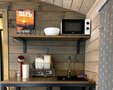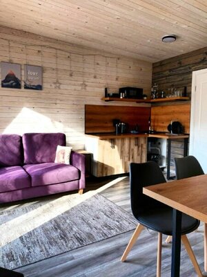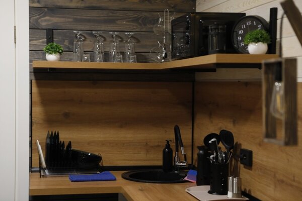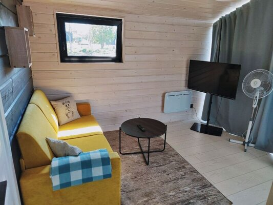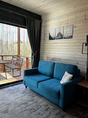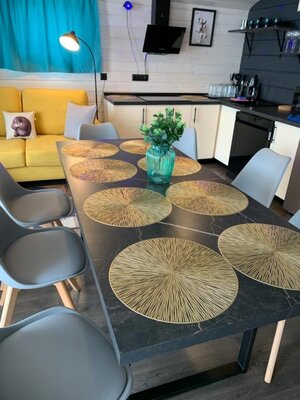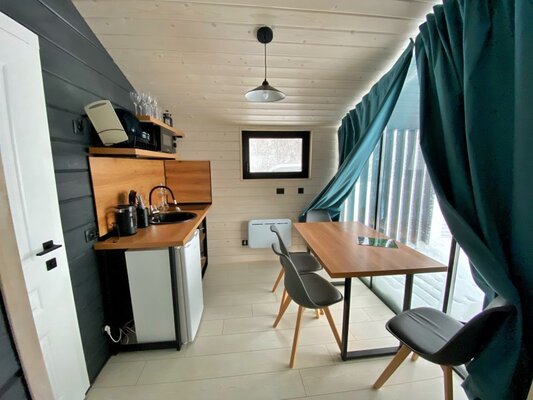 В гостиной расположен кухонный модуль с посудой на 6 гостей, микроволновая печь, электрический чайник, заварочный чайник, кулер с питьевой водой. В гостиной есть стол и стулья, кожаный диван, печь-камин, плазменный телевизор, телефон для связи с ресепшн, плотные шторы блэкаут.