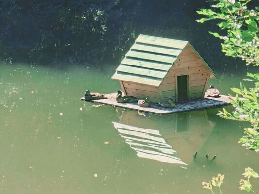 На берегу пруда расположен небольшой песчаный пляж с удобными шезлонгами .