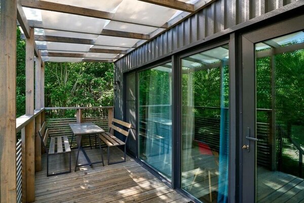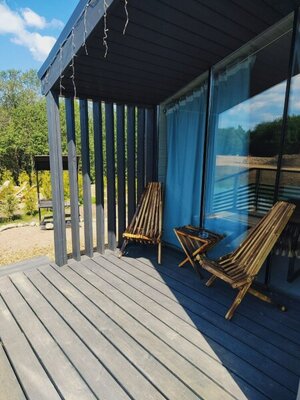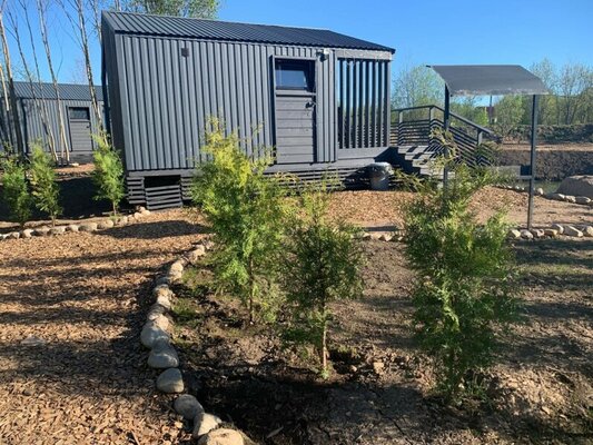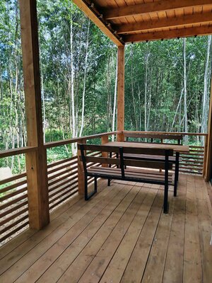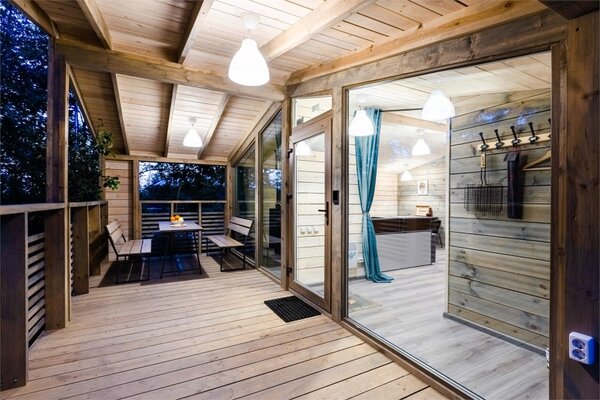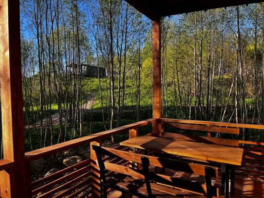 Терраса имеет стол и две скамьи для отдыха, зонированный свет, розетки. Рядом с террасой купель с подсветкой и подогревом, а также мангальная зона с уличной мебелью. Пространство между банными домами зонировано туями и ландшафтом, скрывающими гостей от посторонних глаз.