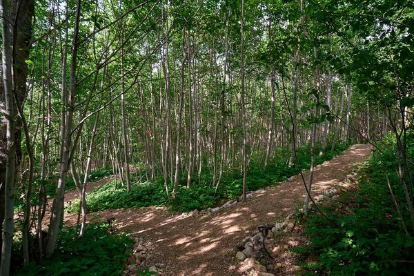 Эко-тропы проходят по берегу ручья. Вечерняя подсветка придает сказочную атмосферу.