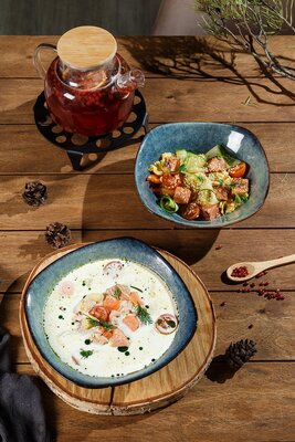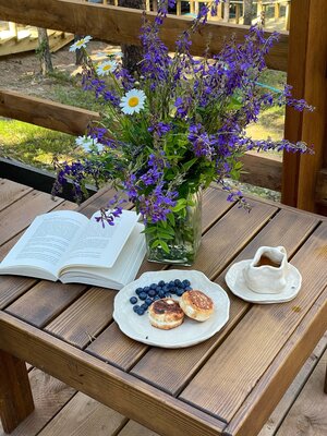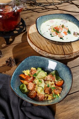 Из окон шатра открывается прекрасный вид на лес, что создает особую атмосферу уюта и спокойствия. Здесь вы сможете насладиться блюдами, приготовленными с любовью и заботой, а также ароматным авторским чаем и кофе.