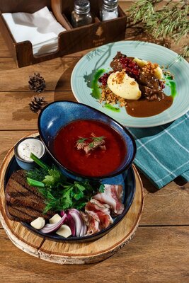 Вы можете разместиться за столиком или заказать доставку в домик. Последний заказ кухня принимает в 20:30.