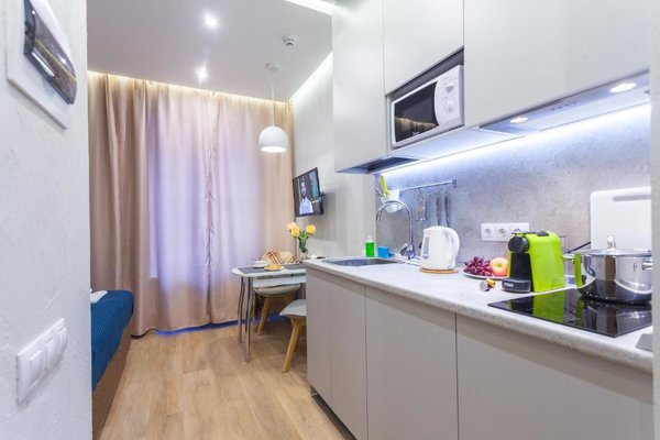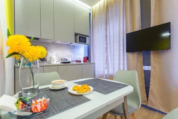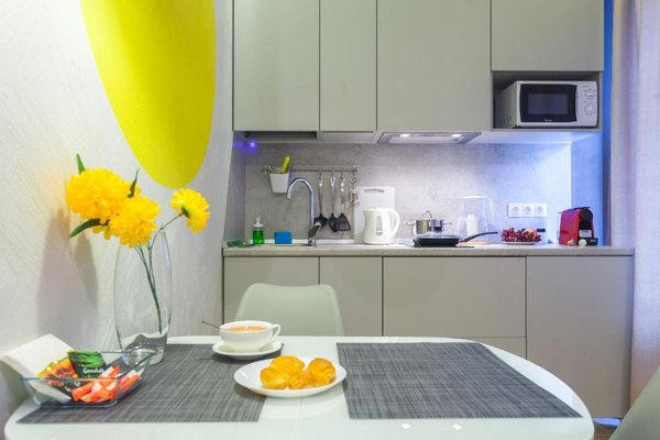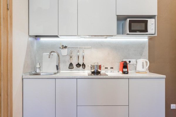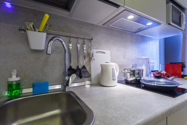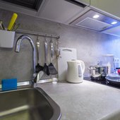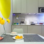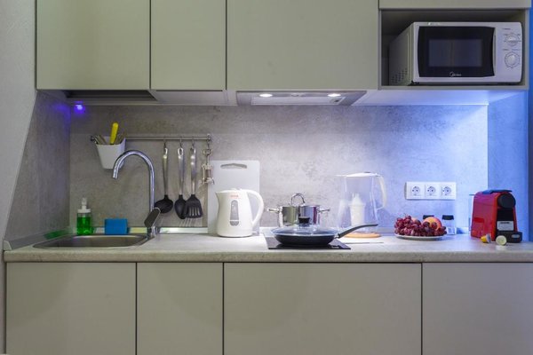 Приготовить блюдо любой сложности можно на полностью оборудованной кухне, которая есть в каждых апартаментах. Современная техника включает в себя микроволновую печь, чайник, варочную панель и электрический чайник.