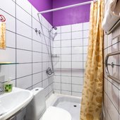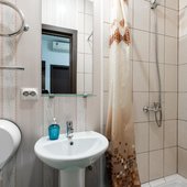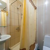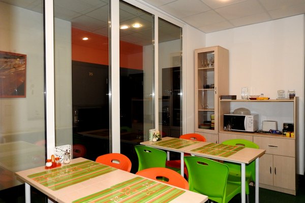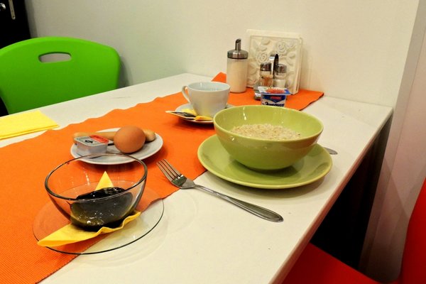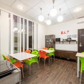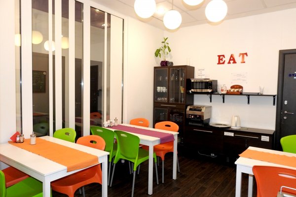 Самостоятельным приготовлением блюд возможно заняться на общей кухне с бытовой техникой, посудой, рабочей и обеденной зоной. Кроме того, поблизости работают заведения общественного питания: небольшие кафе, бистро, рестораны, есть продуктовые магазины, супермаркет.