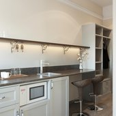 Для постояльцев проводят завтраки, можно также заказать дополнительные блюда за отдельную стоимость. На территории есть автомат с закусками и напитками. В категориях "Комфорт" и "Делюкс" есть собственная мини-кухня, на которой можно приготовить любимые блюда. Она оснащена всеми необходимыми принадлежностями, бытовыми приборами и посудой.