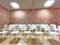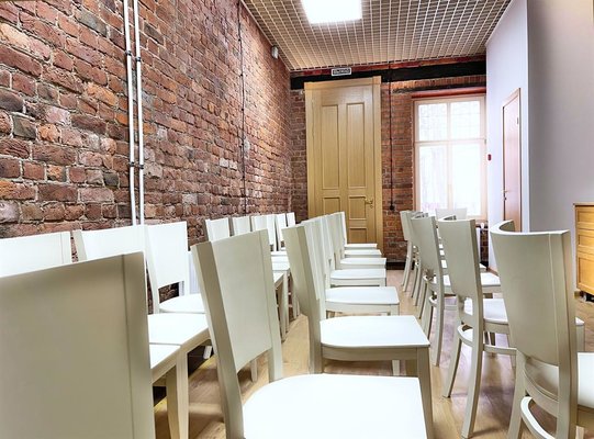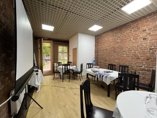 Зал позволяет комфортно разместить до 20 человек круглыми столами, до 30 театром.