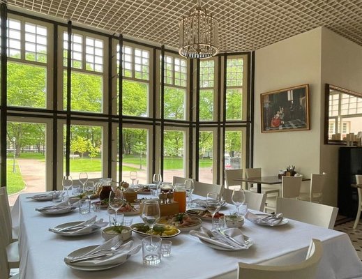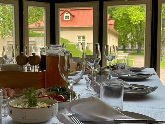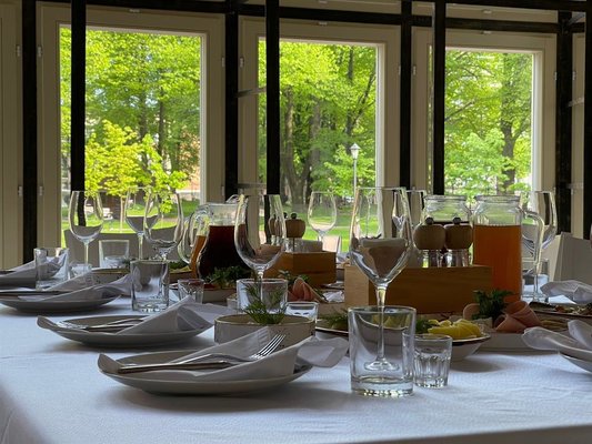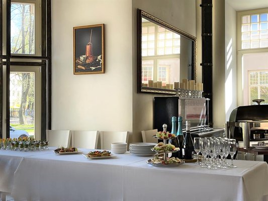 В распоряжении гостей панорамный зал «Ротонда», выход в парк с фонтаном, фоновая или живая музыка, интерьеры усадьбы и блюда от шеф-повара - как лёгкие закуски, так и полное банкетное меню.