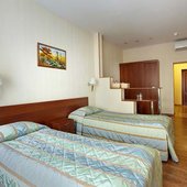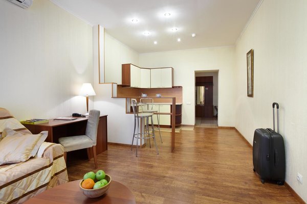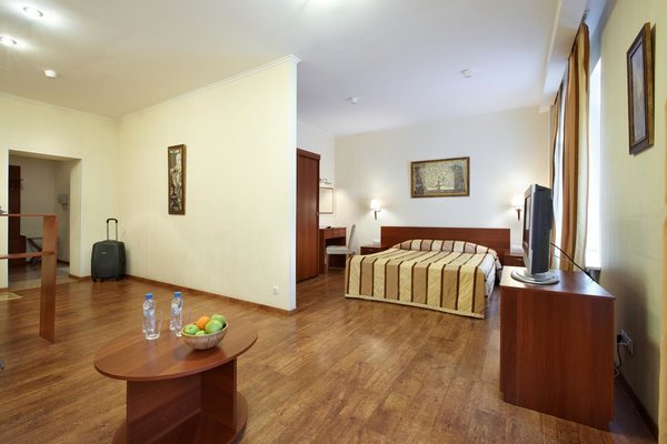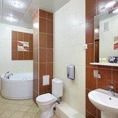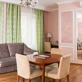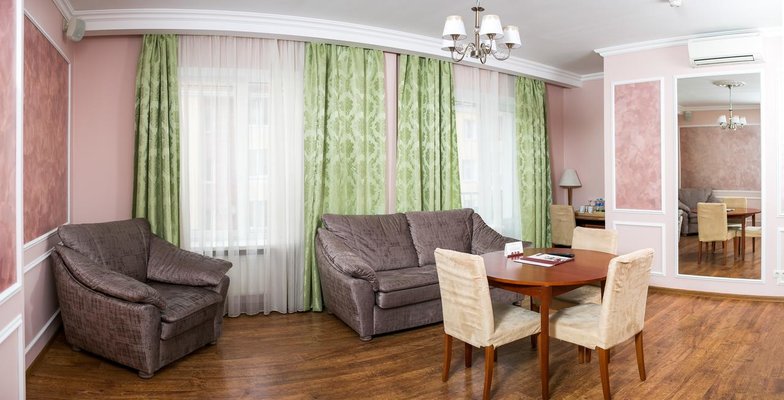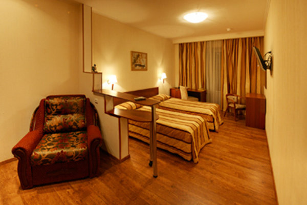 Вполне устроил отель. Останавливалась в номере "Люкс" (4 этаж). В номере есть чайник, холодильник (мини-бар), халат, тапочки, туалетные принадлежности, микроволновки нет. Для этой категории цена была дешевле "стандарта" в других отелях. Номер имеет просторную гостиную...