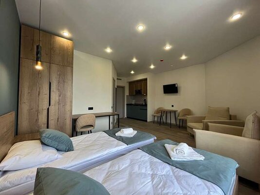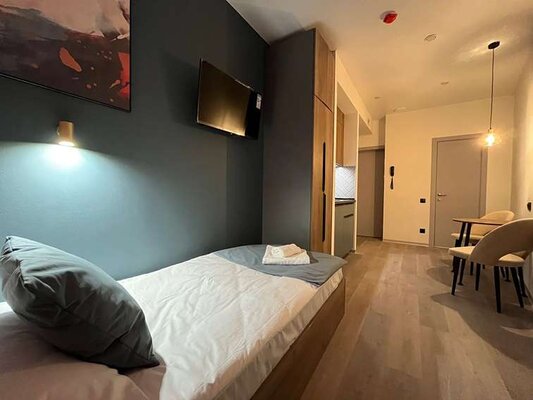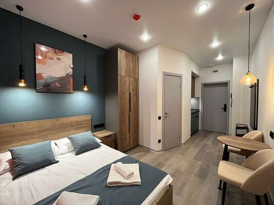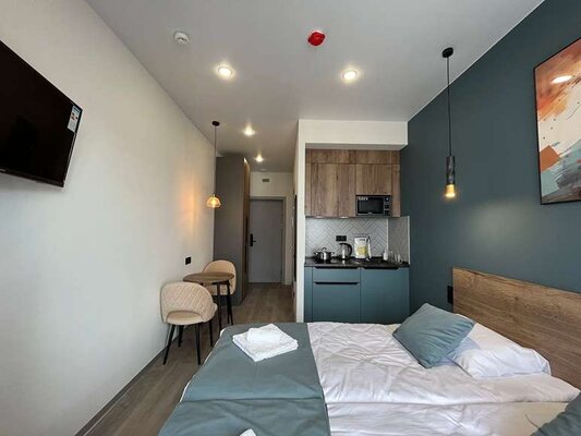 После насыщенного дня туристы смогут отдохнуть в уютных студиях. В них выполнен современный ремонт в свежих теплых тонах. В апартаментах есть удобная мягкая мебель, телевизор, собственная ванная комната с туалетно-косметическими принадлежностями. Предоставляется постельное белье, полотенца и тапочки.