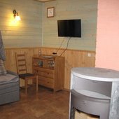 Дополнительно установлен газовый обогреватель. Можно комфортно находиться даже при небольшом минусе. Также рядом большой мангал с вертелом и казаном. Сдается как проживающим в коттеджах, так и отдельным компаниям.