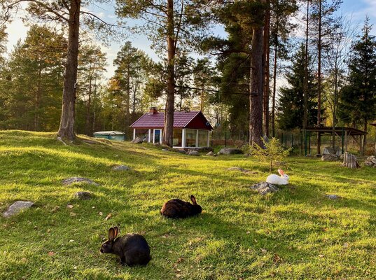 Эко–хутор радует гостей возможностью понаблюдать за животными на мини–ферме. Козы, овцы и куры находятся в специальном огороженном вольере, а пушистые кролики свободно гуляют по территории. В пруду плавает стайка гусей. Все животные дружелюбные и ласковые. Их можно погладить, покормить и сфотографироваться с ними.