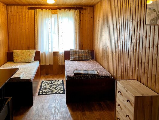 Отличная деревенская банька на дровах довольно просторная и может вместить до 8 человек. Банный комплекс состоит из комнаты отдыха с большим столом, двух душевых, парилки, хаммама, санузла и бильярдной. Бильярд находится на 2-ом этаже бани. Можно приобрести березовые веники, а также заказать травяной чай с мёдом и прохладительные напитки с доставкой в баню.