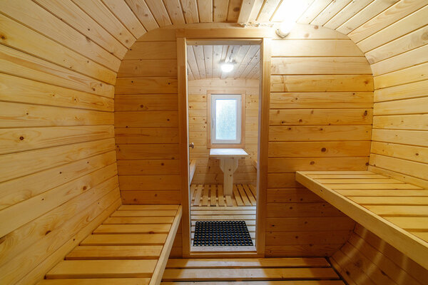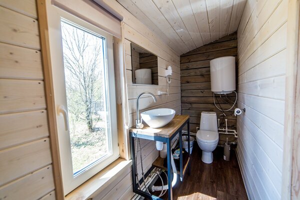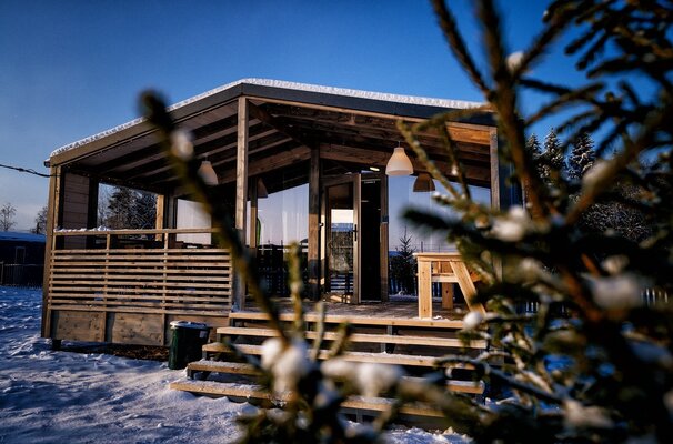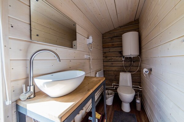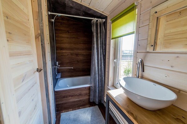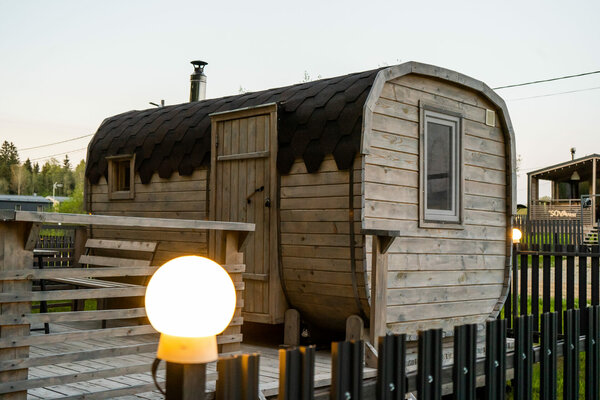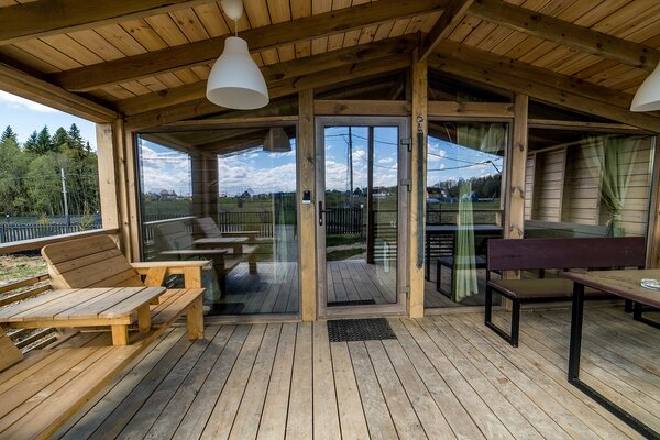 В банном доме есть кухонная зона с кулером, микроволновой печью, чайником и посудой, гостиная зона с панорамными окнами, столом, диваном и телевизором. Совмещенный санузел. Крытая терраса с уличной мебелью.