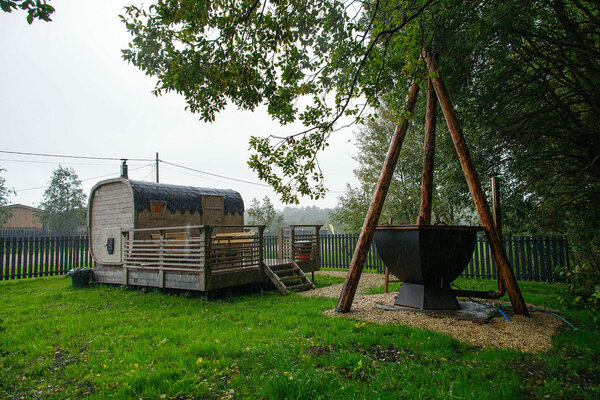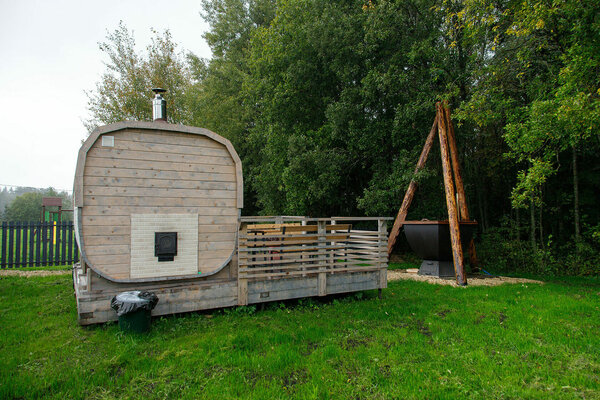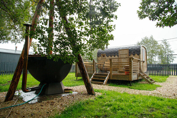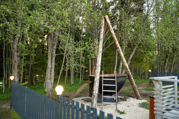Горячие ванны на открытом воздухе. Печь дает возможность нагреть воду до нужной температуры, благодаря чему купание в чане комфортно даже в зимнее время года.