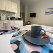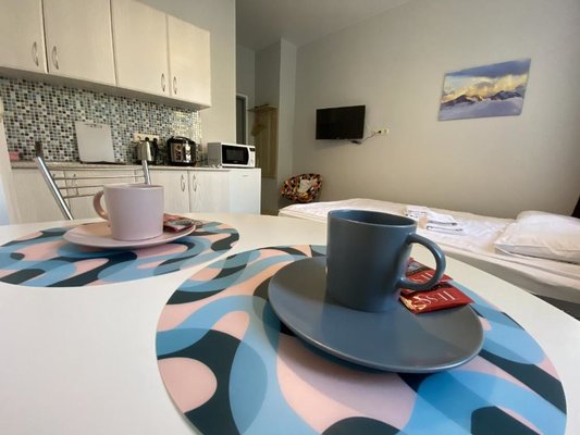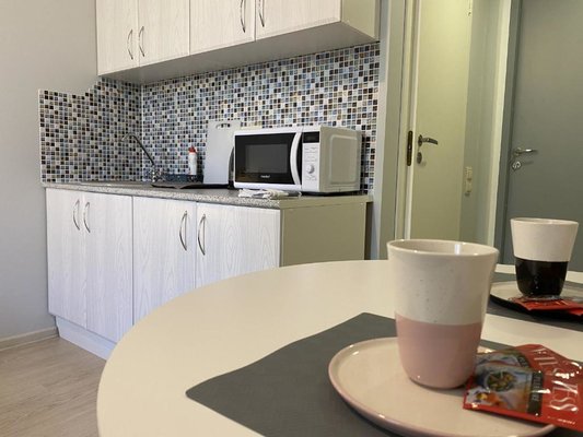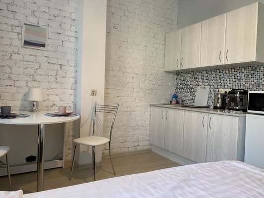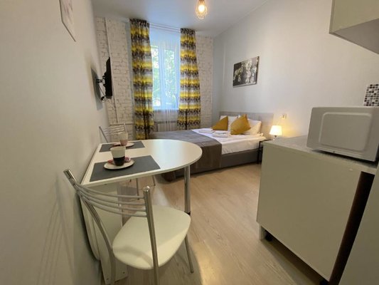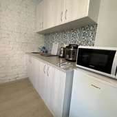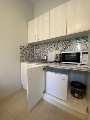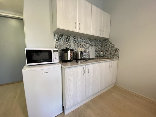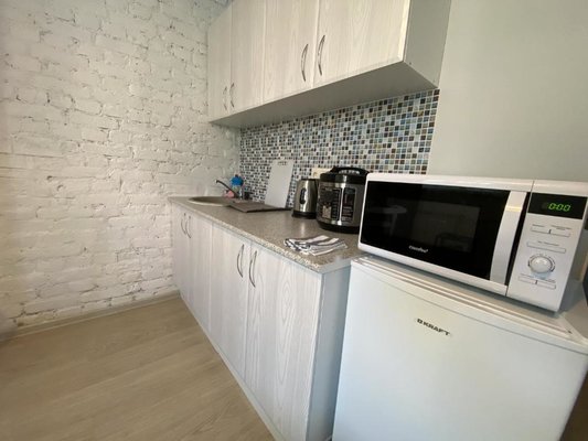 На мини-кухне есть бытовая техника, с помощью которой возможно приготовить не хитрую еду. Возможно заказать доставку еды и напитков.