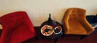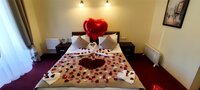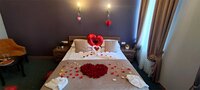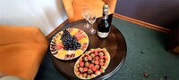 Украшение номера для романтического вечера: лепестки роз, фруктовая тарелка, вино / шампанское, шарики.