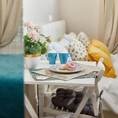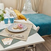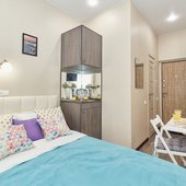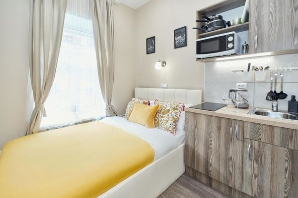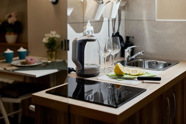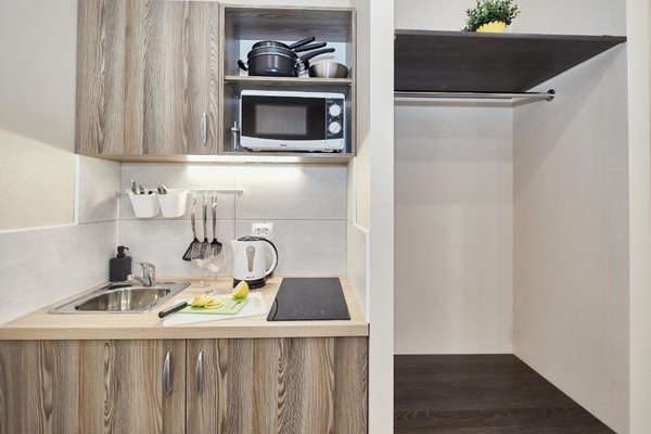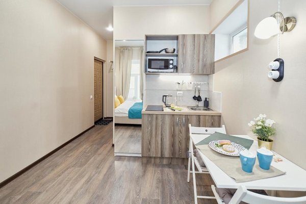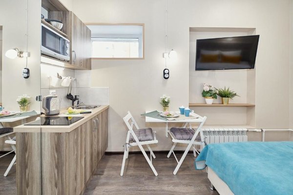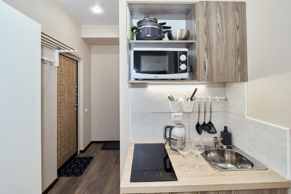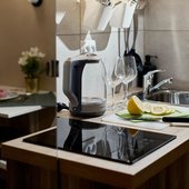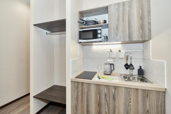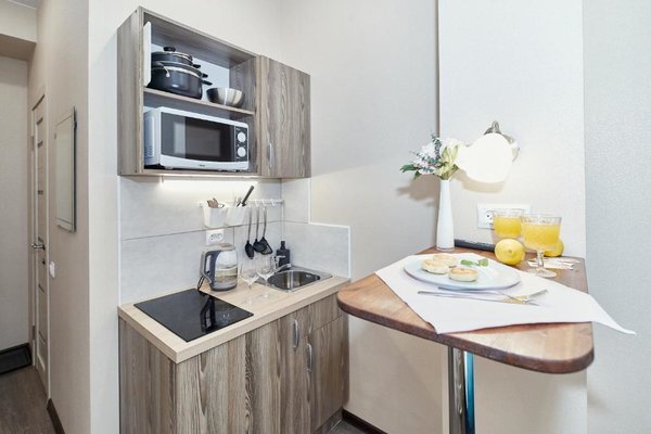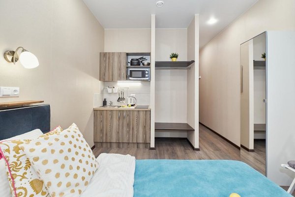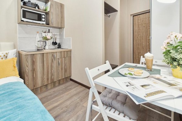 Кухонный уголок располагает бытовой техникой, обеденной зоной. Здесь Вы сможете проявить свои кулинарные способности. Желающие могут посетить рестораны и кафе быстрого питания.