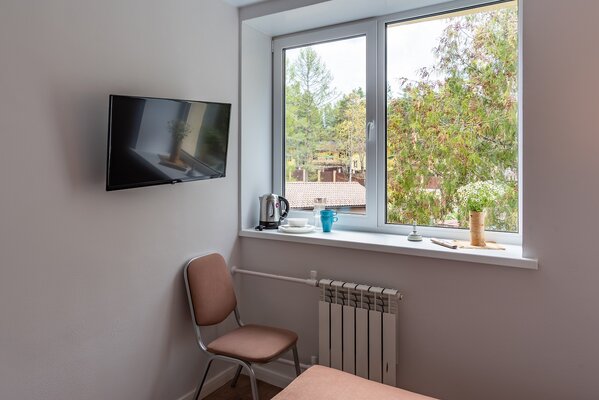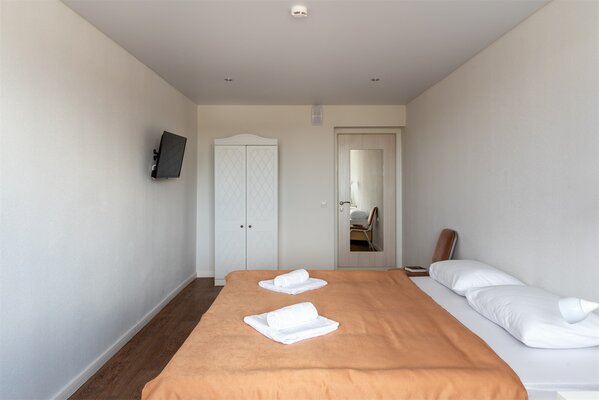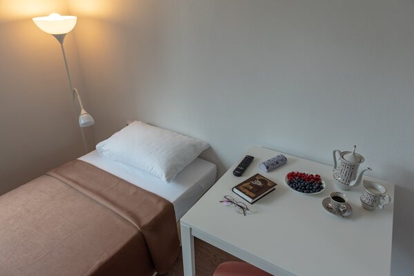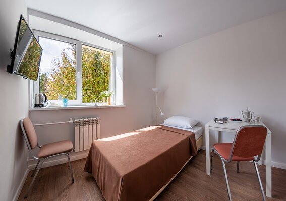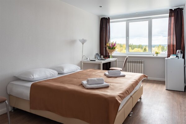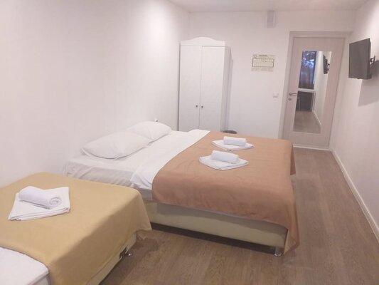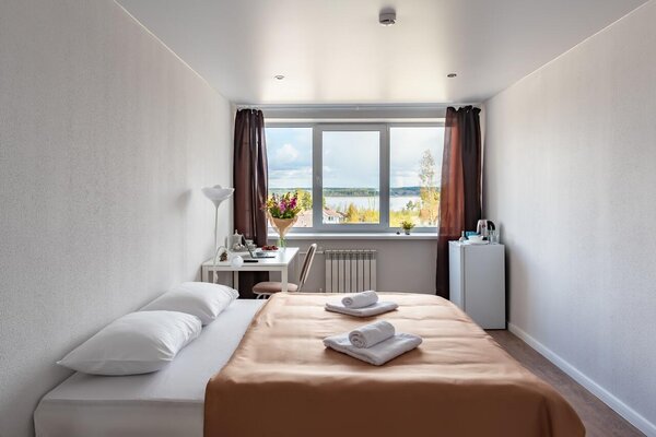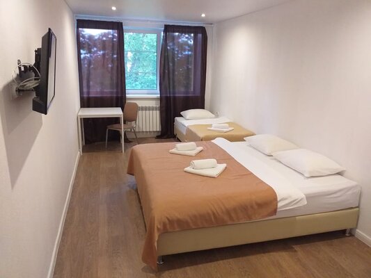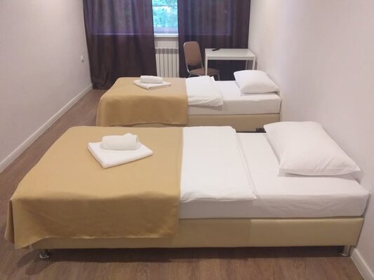 Для вашего полного комфорта в номерах предусмотрено всё необходимое. На каждом этаже вас ждёт полностью оборудованная общая кухня (с плитой, микроволновой печью, чайником и полным набором посуды), уютная обеденная зона и современные общие ванные комнаты.