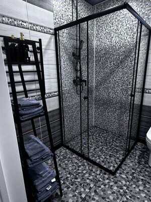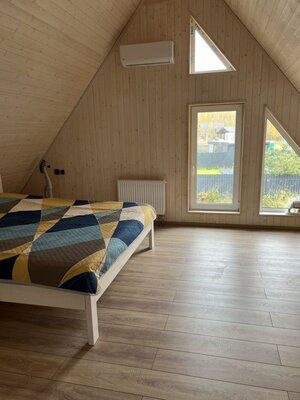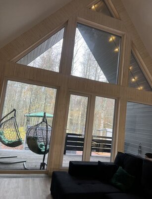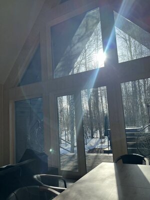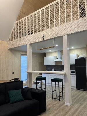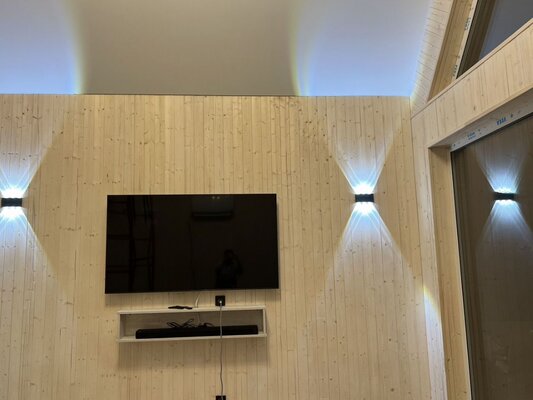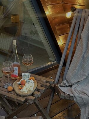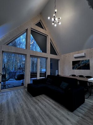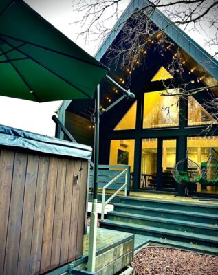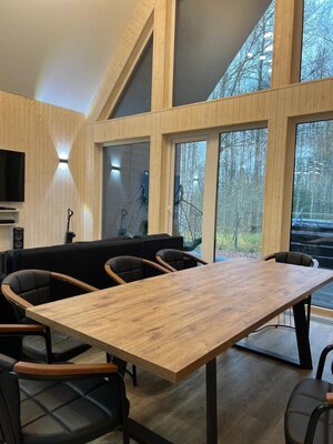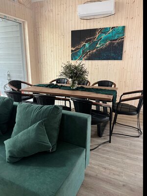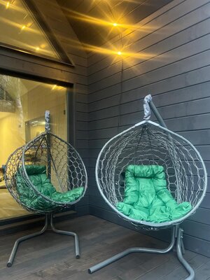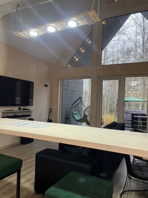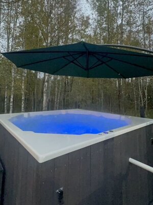 На террасе дома установлена подогреваемая купель на 8 человек с подсветкой и гейзером.