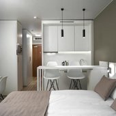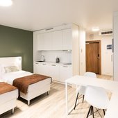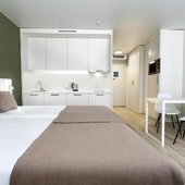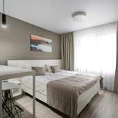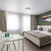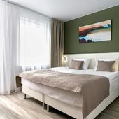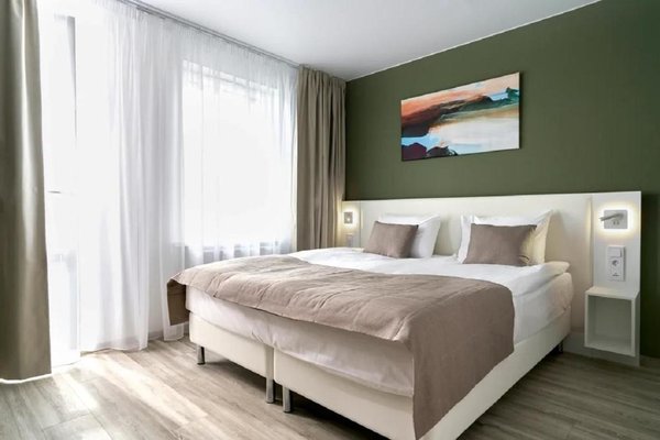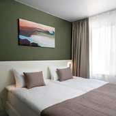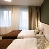 Номерной фонд представлены светлыми номерами, выдержанными в едином современном стиле. Здесь можно почувствовать себя максимально расслаблено и комфортно, так как все продумано до мелочей. Каждая комната оснащена удобной кроватью с белоснежным постельным бельем из хлопка, ЖК-телевизором с кабельными каналами. Есть рабочее пространство с большим письменным столом.