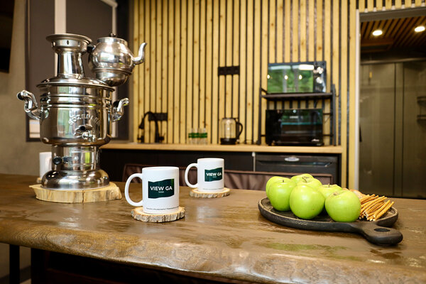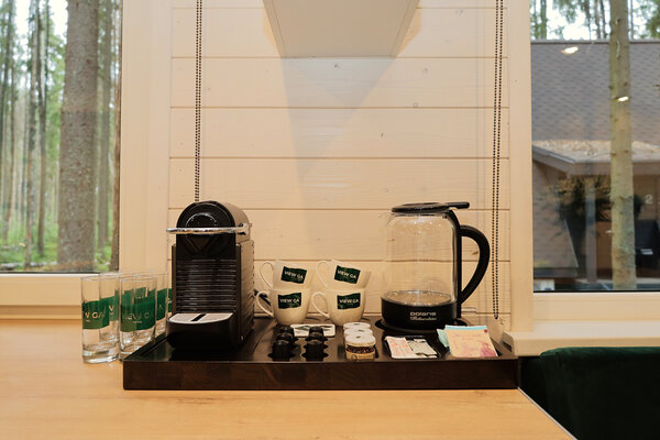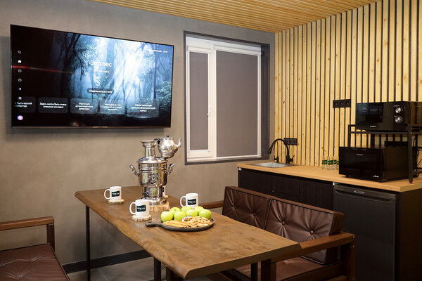 – комнаты отдыха с диваном, столом, телевизором, феном, кухонной зоной с краном с фильтрованной водой, мини-холодильником, микроволновой печью, электрическим чайником и посудой для сервировки;