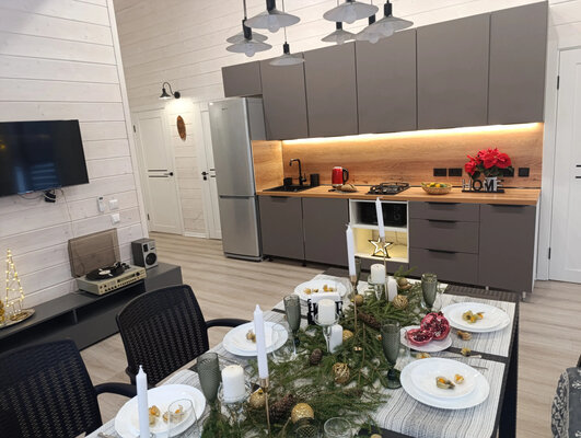 Внутри вас ждет уютная кухня, оборудованная всем необходимым для приготовления пищи: газовая плита, микроволновая печь, полный комплект посуды и приборов. К услугам гостей — чай, кофе и просторный обеденный стол. Для приятного времяпрепровождения в доме есть книги и проигрыватель с виниловыми пластинками. Коттедж располагает тремя спальнями с двуспальными кроватями, одна из которых оборудована вместительным шкафом-купе.