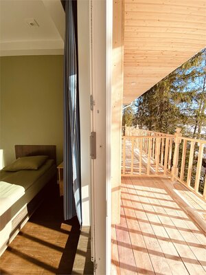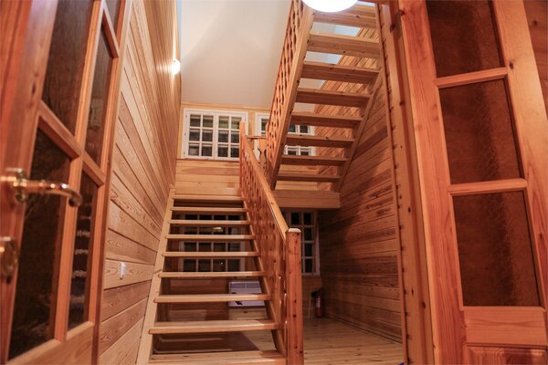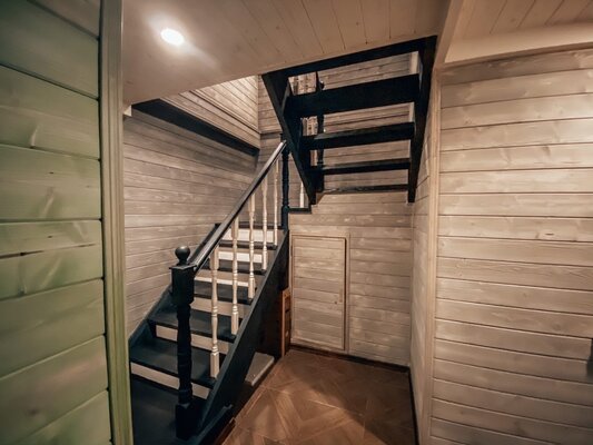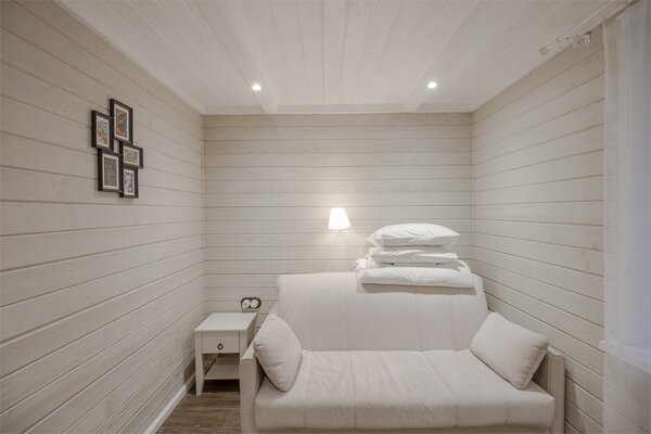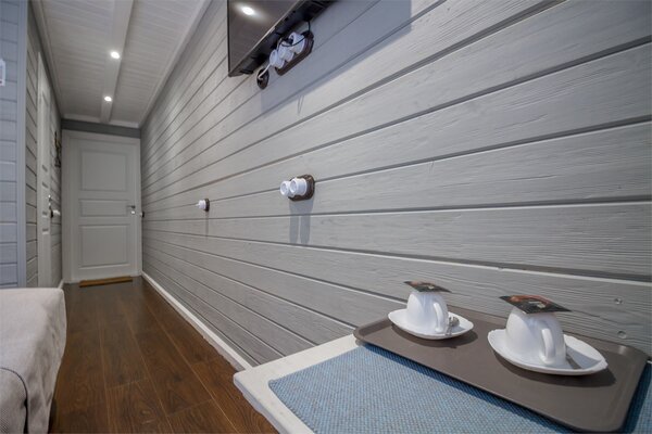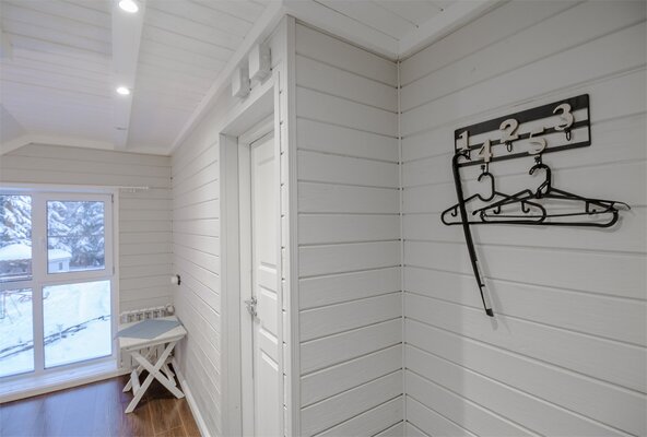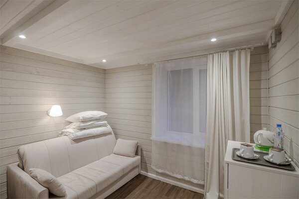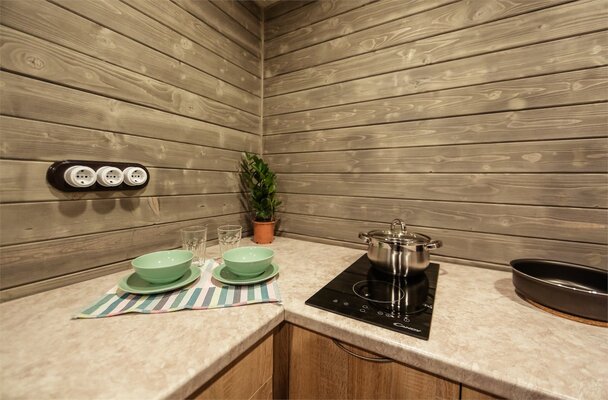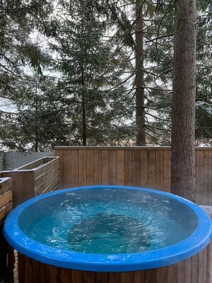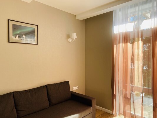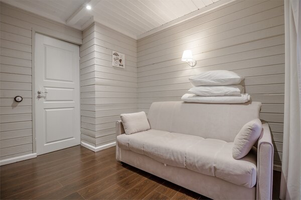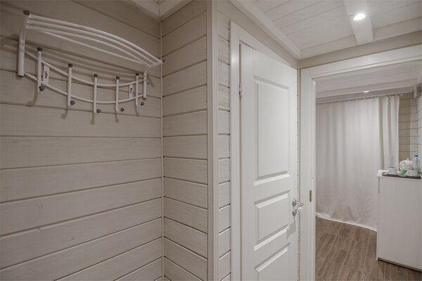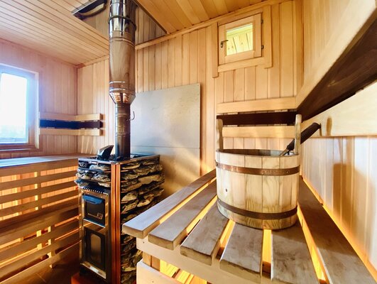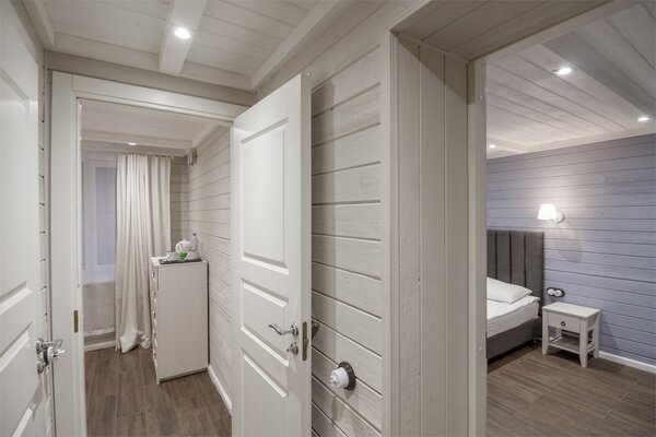 Санузел и душевая, оборудованные обливным ведром, добавляют изысканности и удобства. На собственной террасе под открытым небом расположены уютные купели — теплые и холодные, — которые создают атмосферу умиротворения.