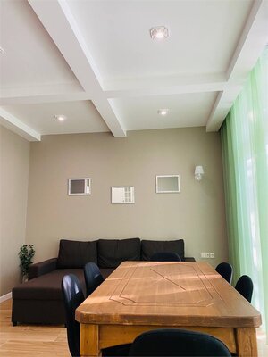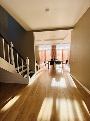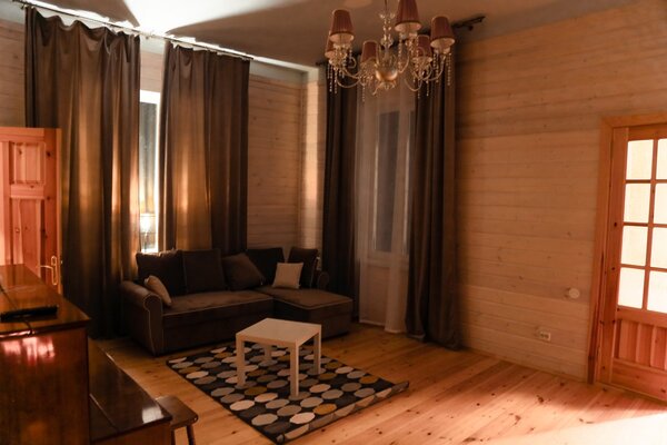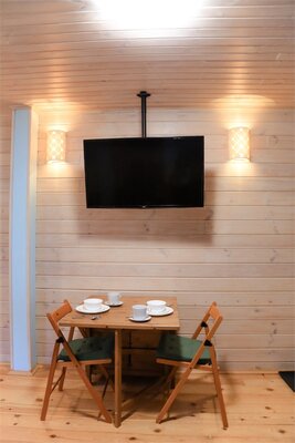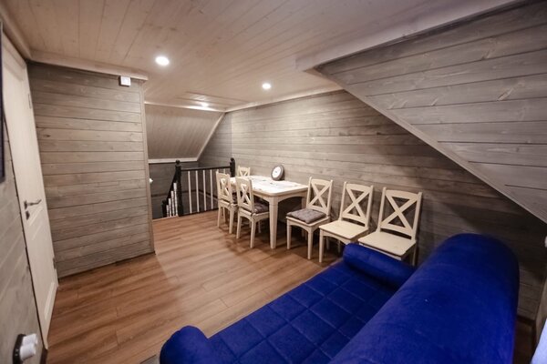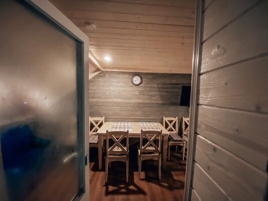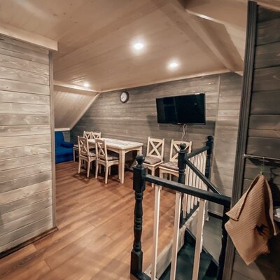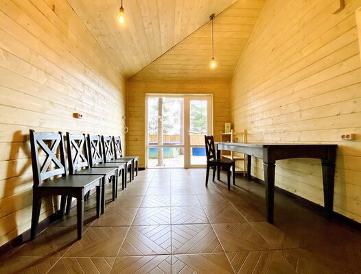 Интерьер бани, выполненный из дерева, поражает своей гармонией и уютом. Просторный гостевой зал с телевизором и обеденным столом создает атмосферу комфорта и гостеприимства. Комната отдыха с мягким диваном приглашает к неспешным беседам и отдыху. Парная с панорамным видом на природу дарит незабываемые ощущения.