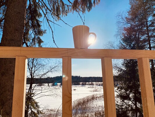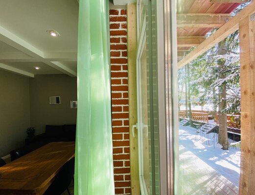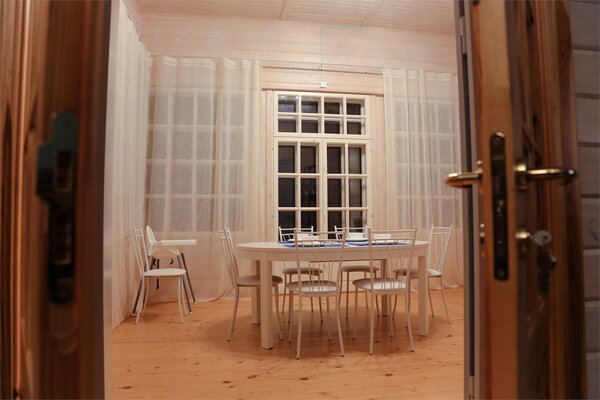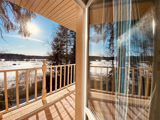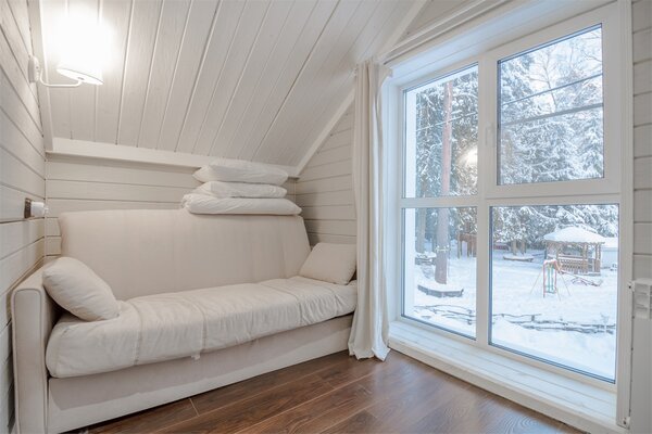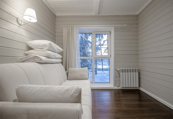 Русская баня с панорамным окном, откуда открывается живописный вид на террасу и заводь реки Оредеж. Это место идеально подходит для компании из шести-восьми человек, независимо от времени года.