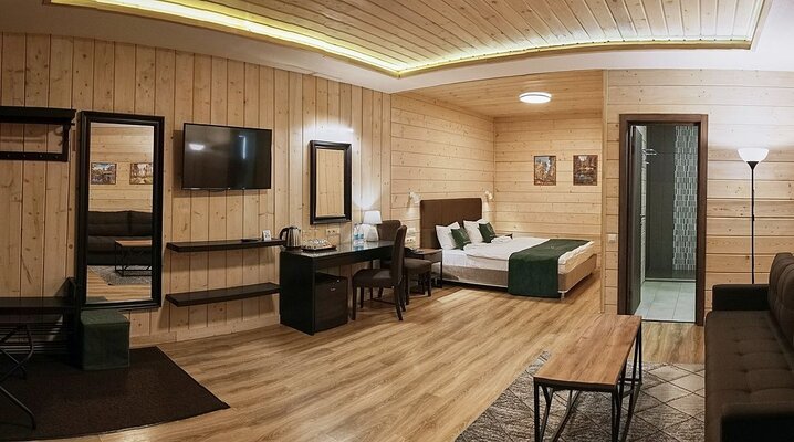 Это просторное банное пространство рассчитано на компанию до 10 человек, предлагая все необходимое для роскошного банного отдыха. Изюминку комплекса составляют две парные: одна топится на дровах, создавая аутентичную атмосферу, другая оснащена современной электрической печью. После процедур можно с комфортом расположиться в уютной зоне отдыха, где есть удобные лежаки, телевизор и обеденная зона на 10 персон. Особенное освежение подарит купание в холодной купели размером 2х2 метра.