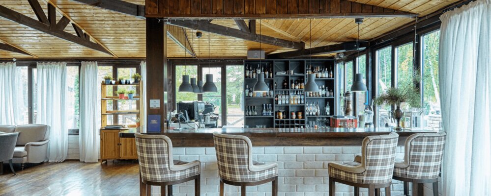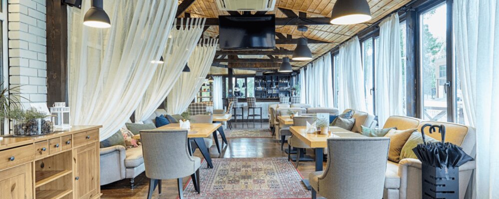 Интерьер ресторана органично вписан в окружающую природу и благоволит спокойствию и умиротворению, а с крытой и открытой веранд открывается вид на природный пейзаж.