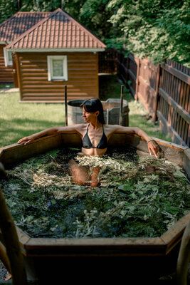Гости могут выбрать между классическим вариантом и купелью с травяной настойкой. В состав добавок входят пихта, мелисса, мята, донник, шалфей, чабрец и тысячелистник, каждая из которых придает процедуре особый аромат и полезные свойства.