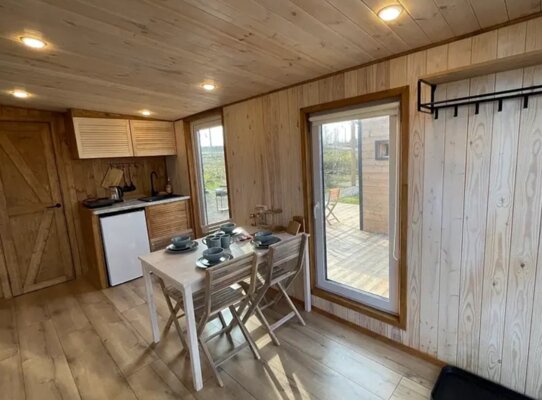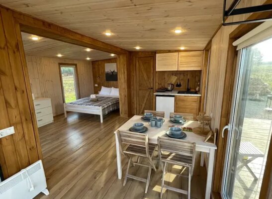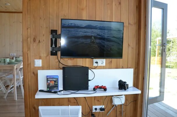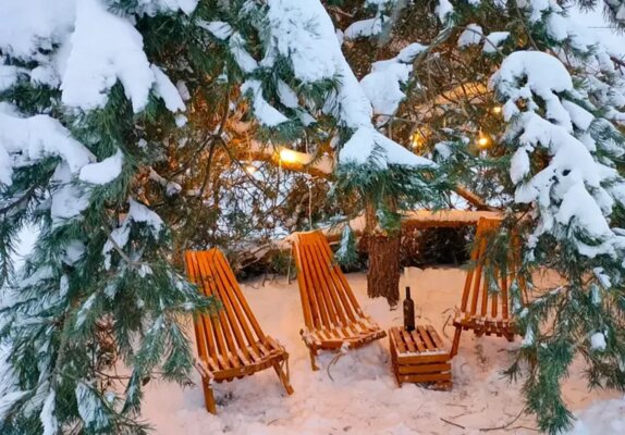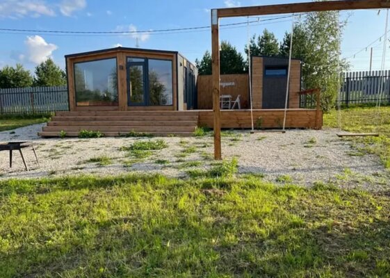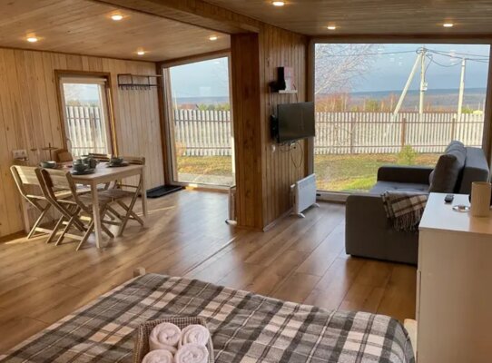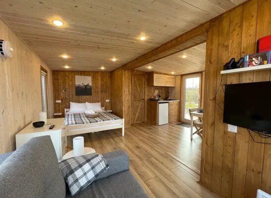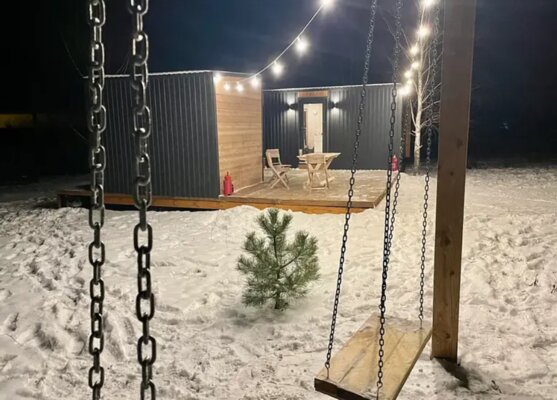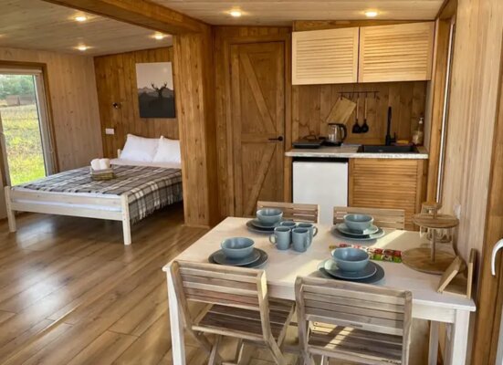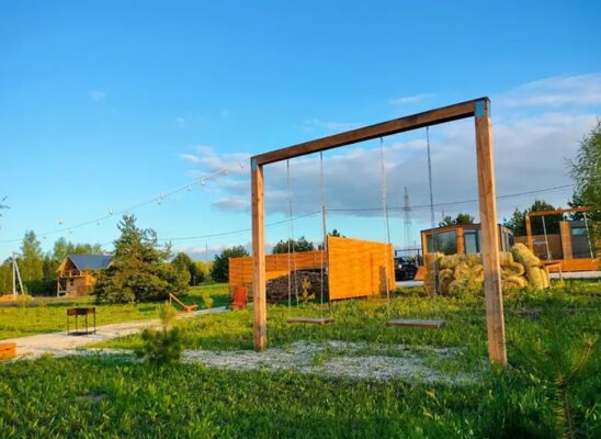 Здесь вас ждут комфортабельные коттеджи «Опушка» и «Берёзка», оборудованные всем необходимым для приятного отдыха: удобная мебель, современная техника, санузел, кухонный уголок с посудой, игровая приставка, настольные игры и потрясающий вид из панорамных окон.