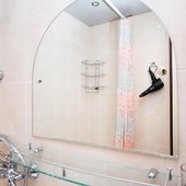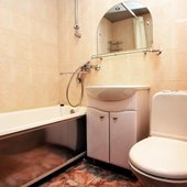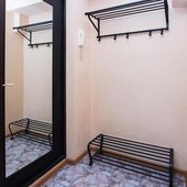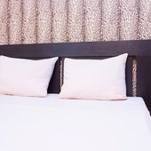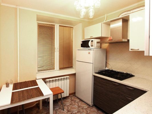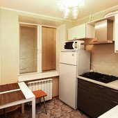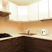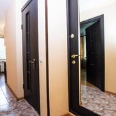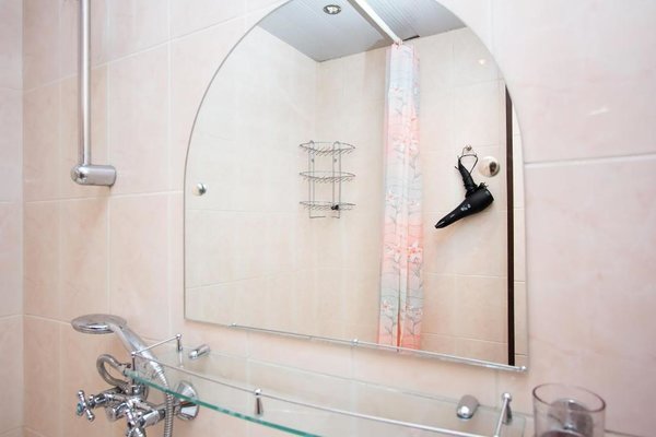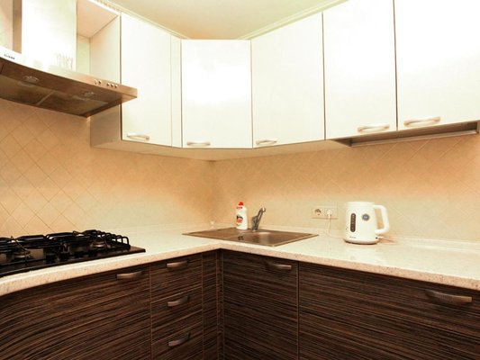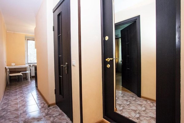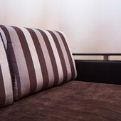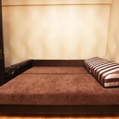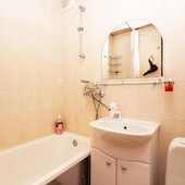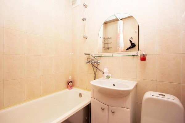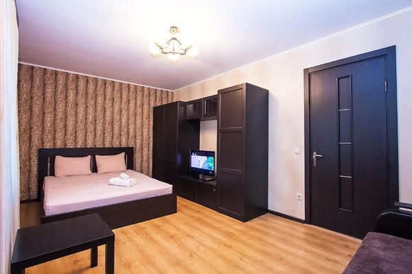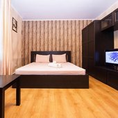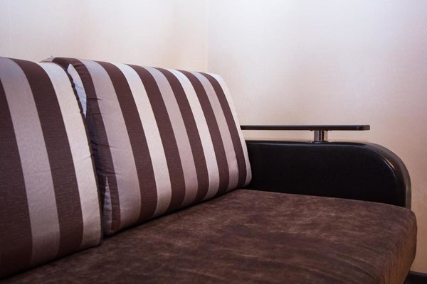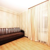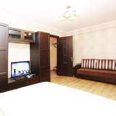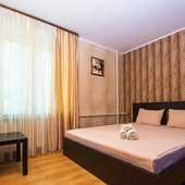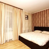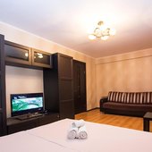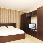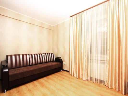 Однокомнатные апартаменты оборудованы двуспальной кроватью и раскладывающимся диваном. Интерьер выполнен в светло-бежевых тонах.