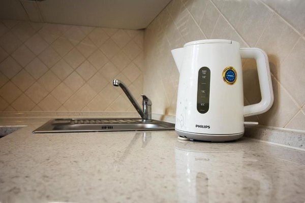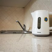 На кухне представлена необходимая техника и посуда для того, что бы гости могли готовить еду себе самостоятельно. Рядом со зданием имеется несколько кафе и ресторанов с разнообразными блюдами.