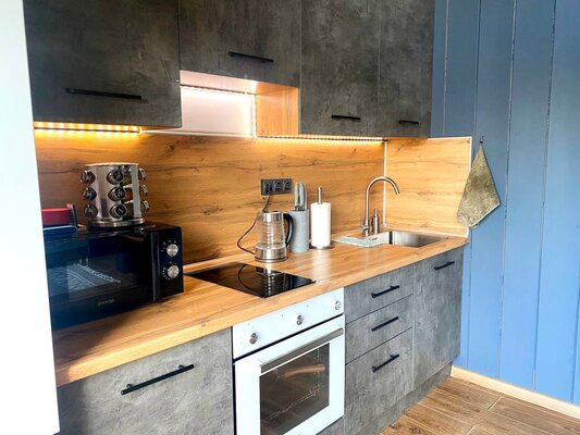 Кухня оборудована для кулинарных шедевров: индукционная плита, холодильник с морозильной камерой, микроволновая печь, чайник, разнообразная посуда и специи.