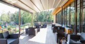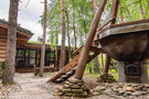 Ландшафтный дизайн территории клуба поражает своей лаконичной архитектурой и утонченным оформлением, гармонично сочетающим минимализм форм с легкими и воздушными конструкциями из натуральных материалов, таких как дерево, стекло и камень.