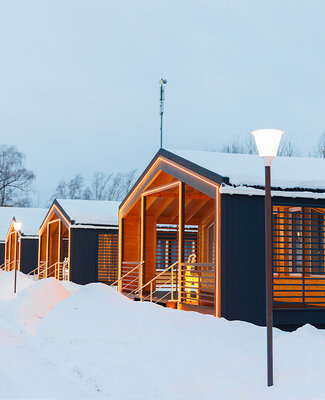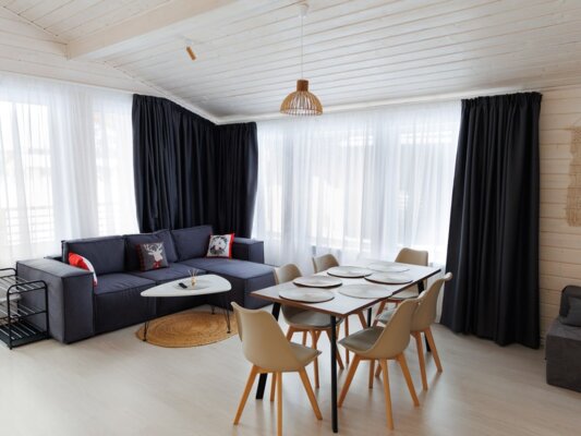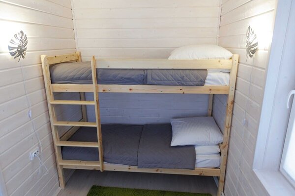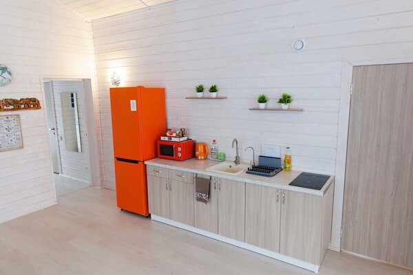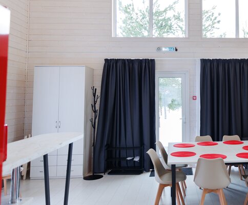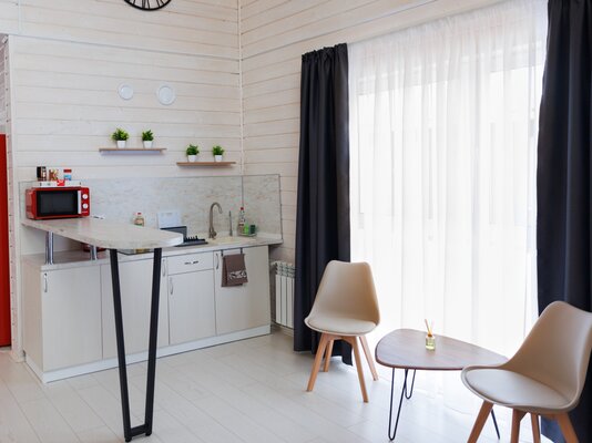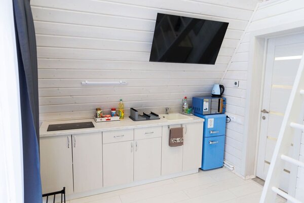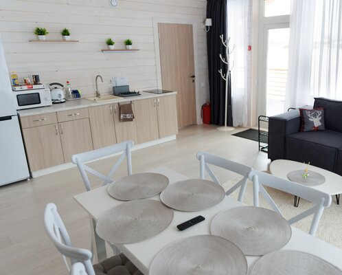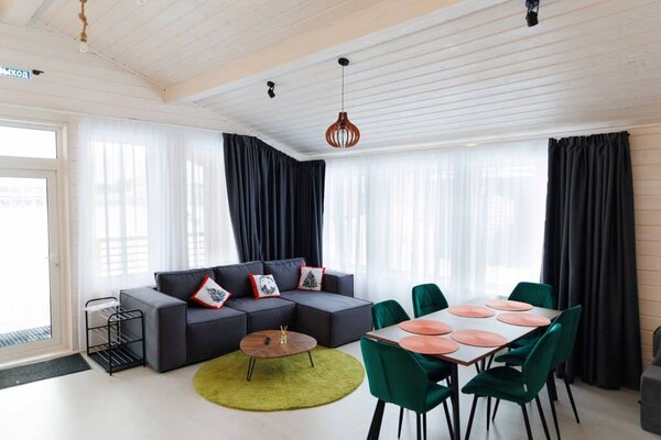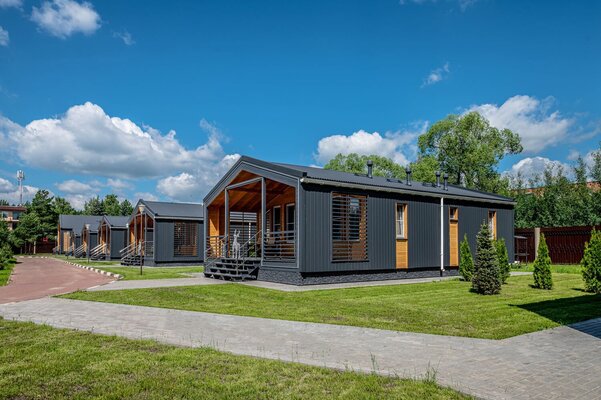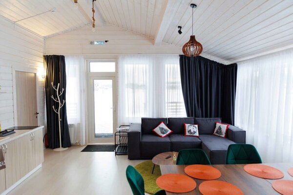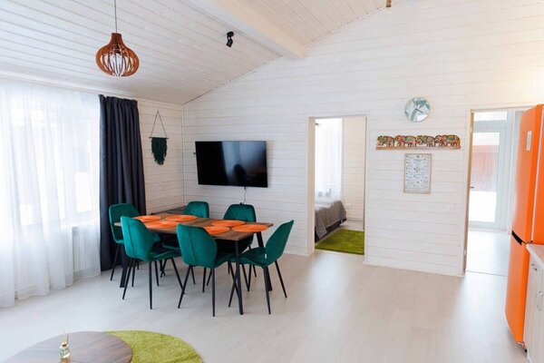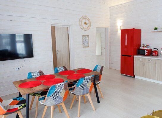 На улице — мангальная зона и столик для отдыха на свежем воздухе. Внутри — кухонный уголок с холодильником и раковиной, санузел, обеденные столы и диван для отдыха. Это идеальное место для семейных праздников и дней рождений, где можно выбрать один из четырех домов разного дизайна и цветовой гаммы для создания незабываемой атмосферы вечера.