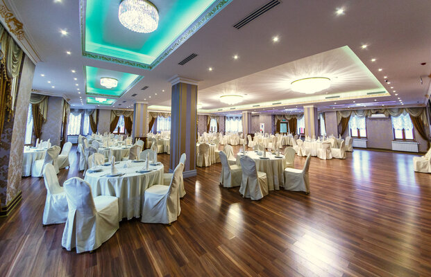 Светлый и необычайно просторный зал с первых минут создает впечатление праздничной атмосферы. Зал выполнен в светлых тонах, что позволяет проводить здесь мероприятия любых форматов: начиная от тематических свадеб и заканчивая корпоративными мероприятиями. Большие окна зрительно делают зал еще больше и светлее и придают особую атмосферу в вечернее время.
