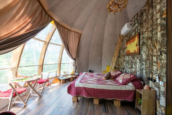 В окружении живописного леса расположены 10 уютных сфер-домиков вместимостью 2 гостя. Каждая сфера — это шедевр архитектуры с панорамными окнами и уникальным дизайном интерьера, площадью 36 м². Все дома оснащены современными удобствами для комфортного проживания. Расстояние между ними (50-70 метров) обеспечивает уединение и спокойствие.