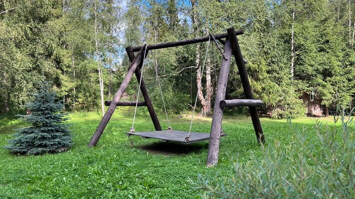 Кроме того, на территории есть баня для гостей дома «Лесной», настольный теннис, а также уютные зоны отдыха с уличными креслами. Особое внимание заслуживает костровая зона и живописные озера с пешеходными мостиками, а также большие качели, которые позволят всей компании собраться вместе и прекрасно провести время.