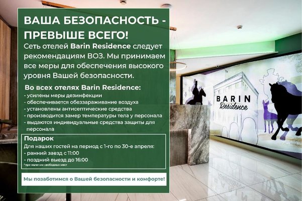 Отель «Barin Residence Grand» приглашает своих гостей в Москву. К услугам проживающих: парковка, терраса, доставка еды и напитков, доступ в интернет, трансфер от и до аэропорта, круглосуточная стойка регистрации, прачечная, ежедневная уборка, камера хранения, запирающиеся шкафчики.