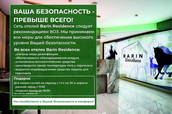 Отель «Barin Residence Myasnitskaya» находится в Москве. К достоинствам сервиса относятся: парковка, доставка еды и напитков, доступ в интернет, трансфер, круглосуточная стойка регистрации, прачечная, ежедневная уборка, камера хранения, запирающиеся шкафчики.