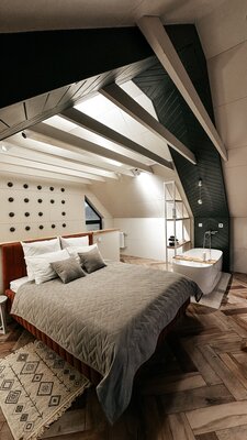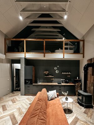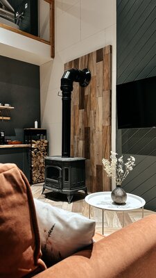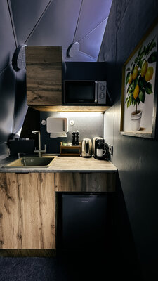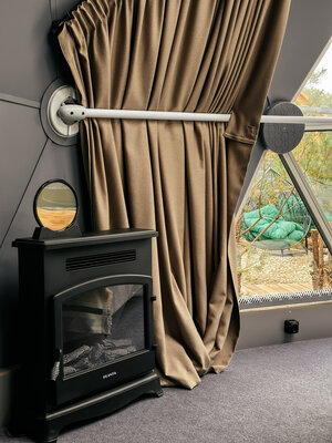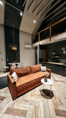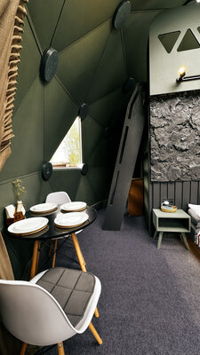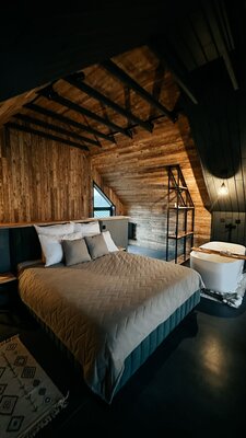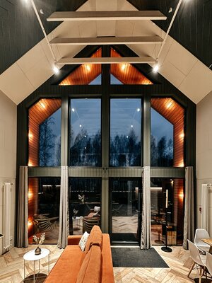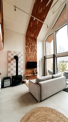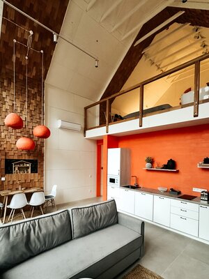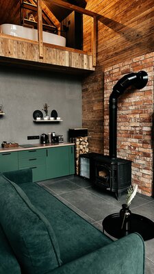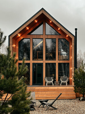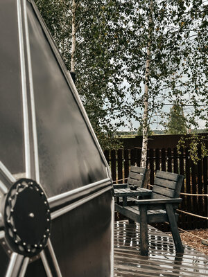 Внутри вас ждет все необходимое для беззаботного отдыха: две удобные двуспальные кровати, полностью оборудованная кухня, современный душ, телевизор, голосовой помощник «Алиса» и атмосферный дровяной камин.
