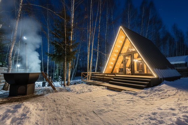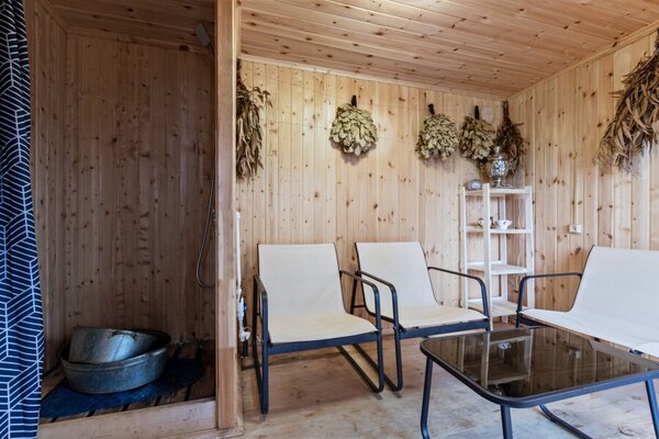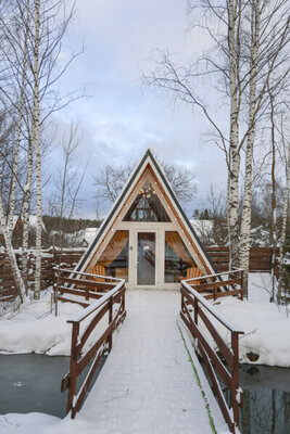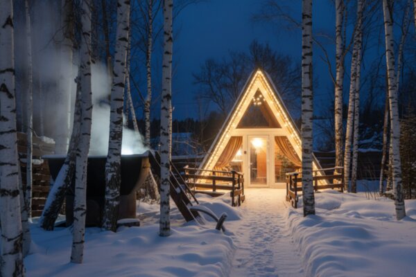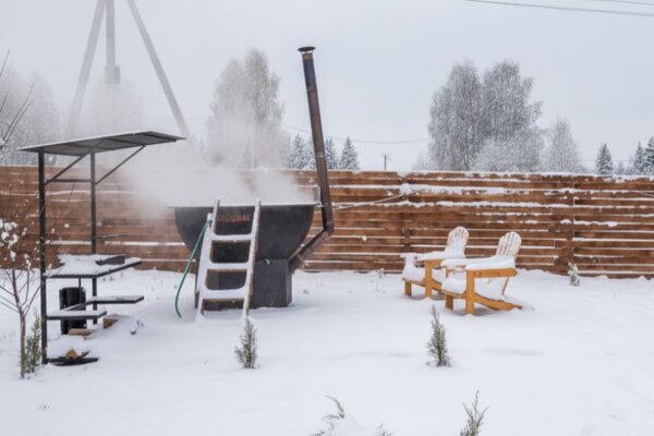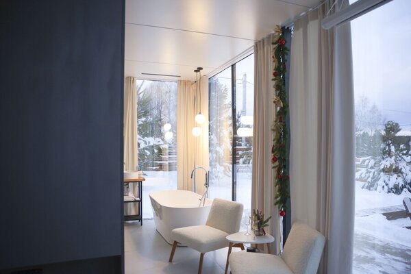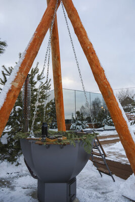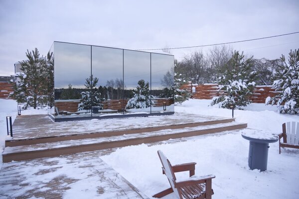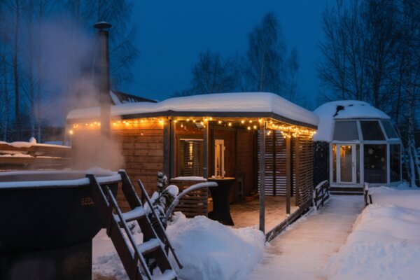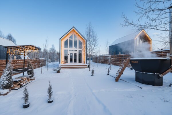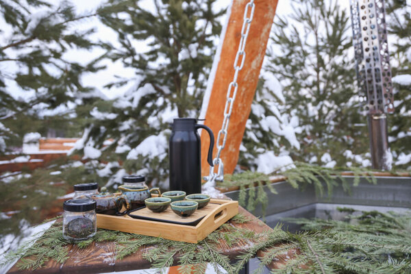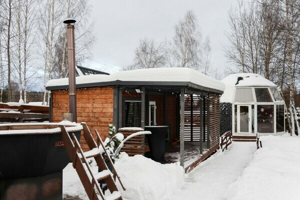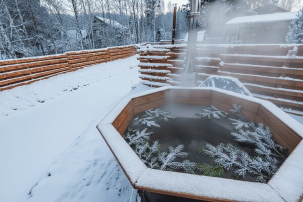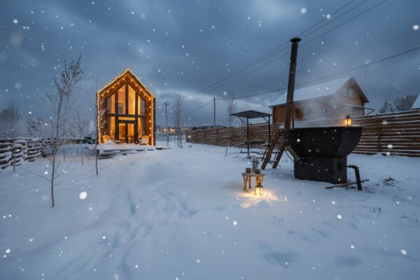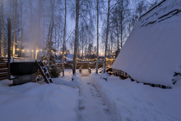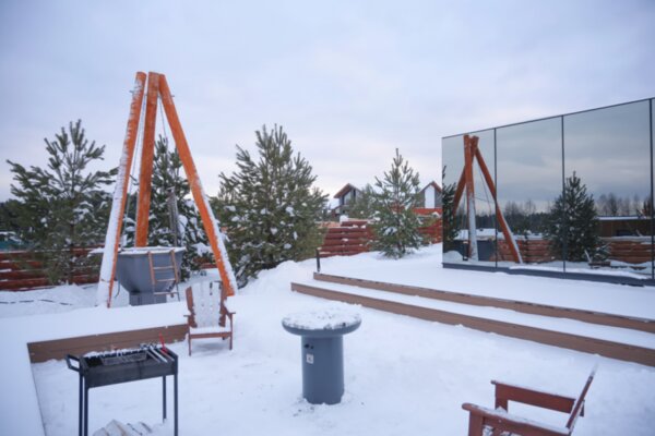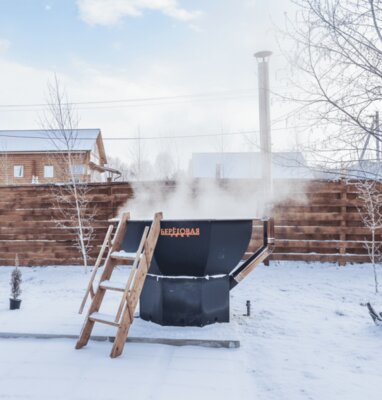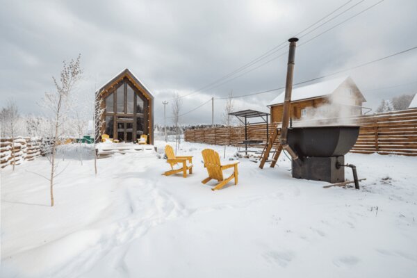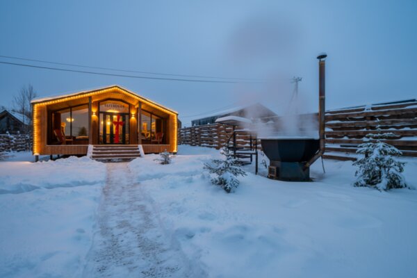 Рядом с каждым коттеджем, за исключением A‑FRAME BLACK, установлен уличный банный чан — уютное место для парения на свежем воздухе. Гостям предлагают как классический вариант парения, так и несколько специализированных программ, чтобы отдых стал еще более расслабляющим и атмосферным.