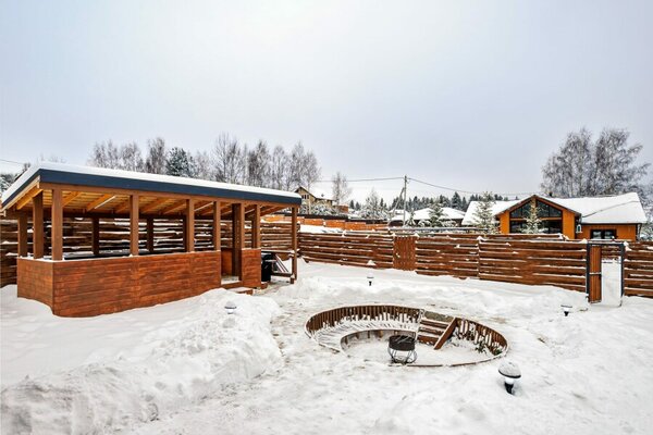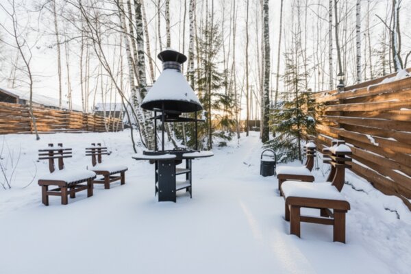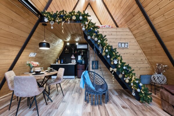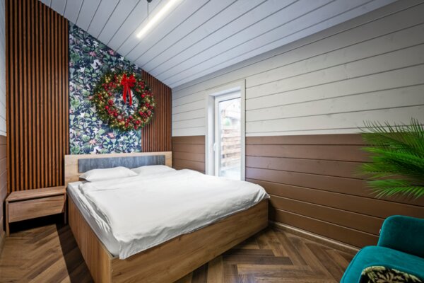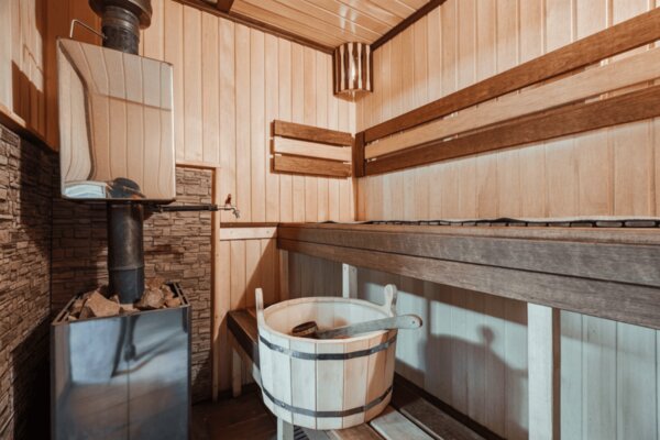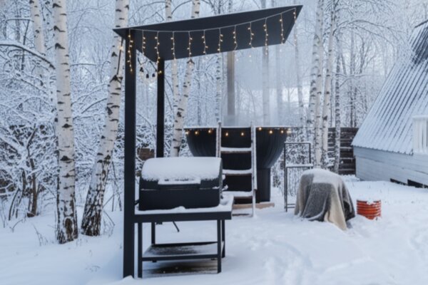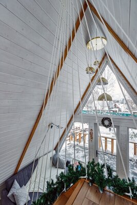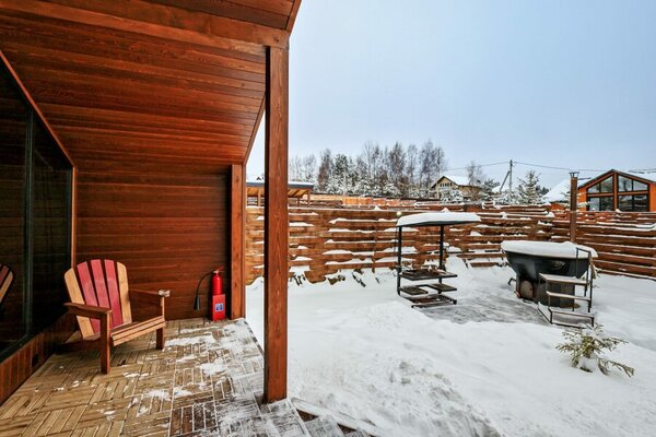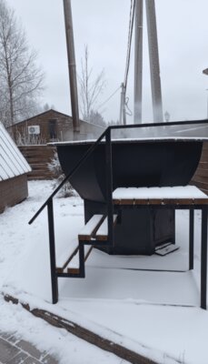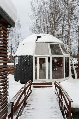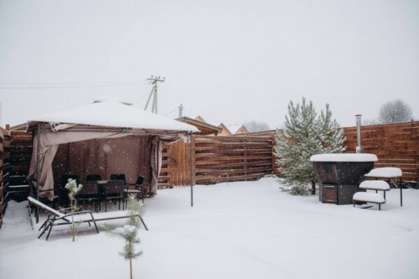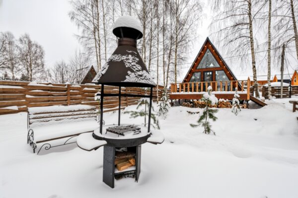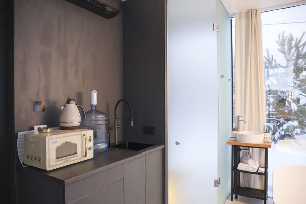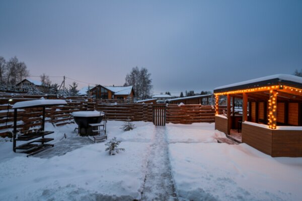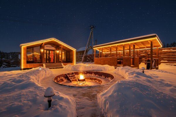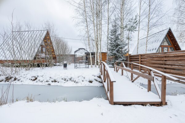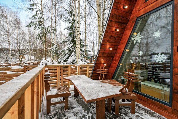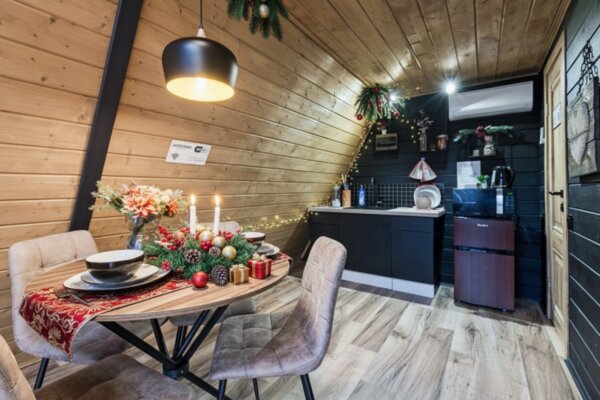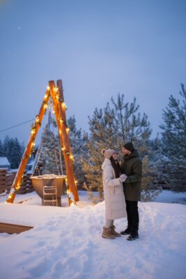 Рядом с каждым коттеджем, за исключением A‑FRAME BLACK, установлен уличный банный чан — уютное место для парения на свежем воздухе. Гостям предлагают как классический вариант парения, так и несколько специализированных программ, чтобы отдых стал еще более расслабляющим и атмосферным.