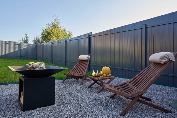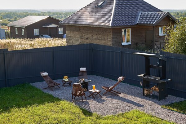 Уютная костровая зона предлагает комфортные кресла-шезлонги для вечерних посиделок. Здесь можно наслаждаться теплом огня, созерцать звездное небо и погружаться в приятные беседы в дружеской атмосфере.