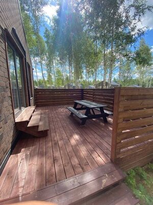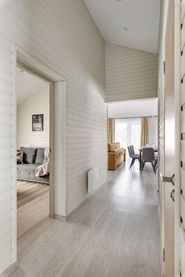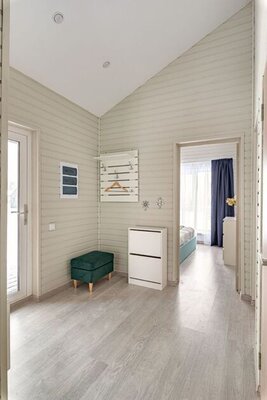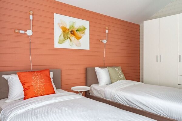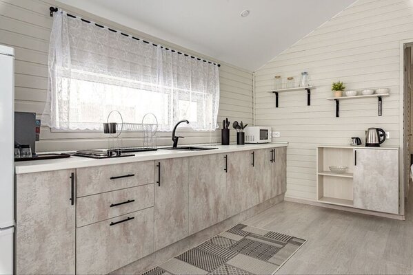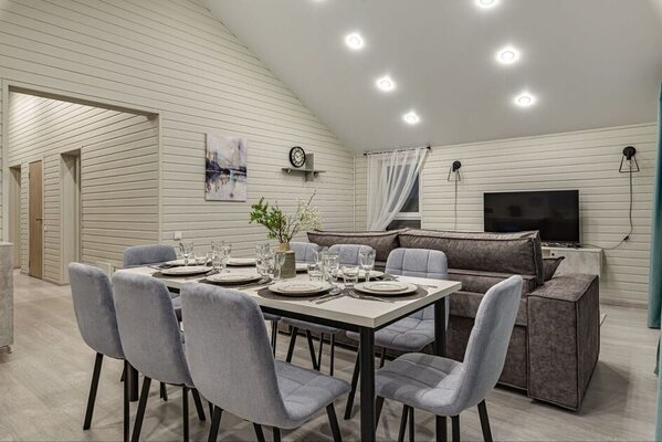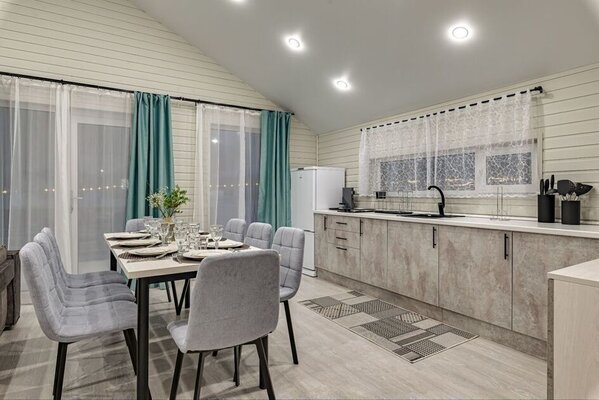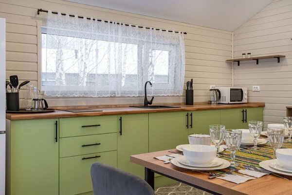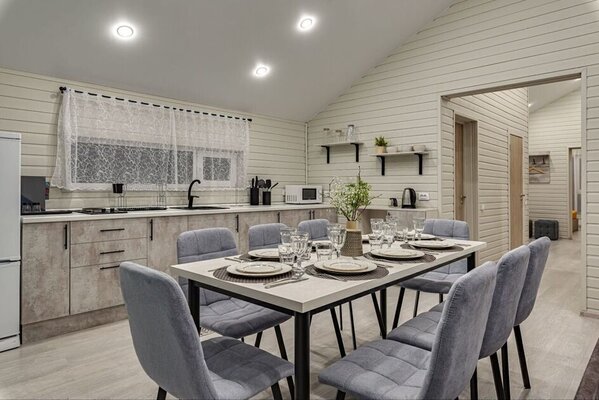 Кухня оснащена всей необходимой техникой — от кофеварки и микроволновки до варочной панели — и посудой, чтобы вы могли легко готовить и наслаждаться трапезами за большим обеденным столом. А для любителей отдыха на свежем воздухе предусмотрена зона барбекю с мангалом и местом для костра, где можно провести теплые вечера в кругу близких. Продумано все до мелочей, включая предоставление гигиенических принадлежностей и парковку на два автомобиля.