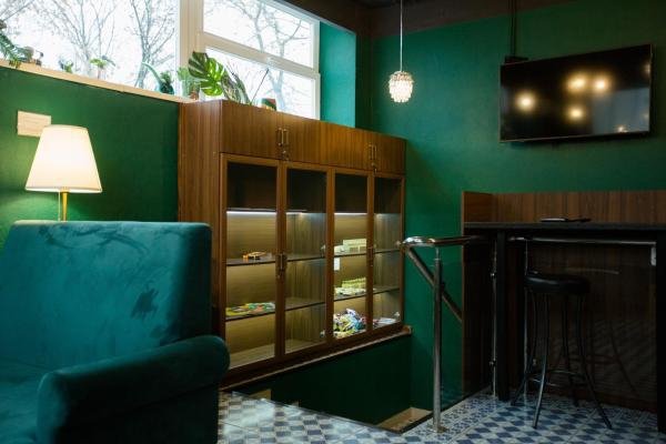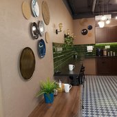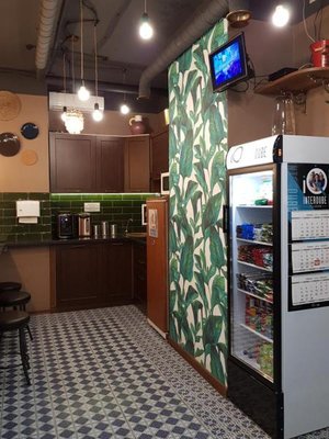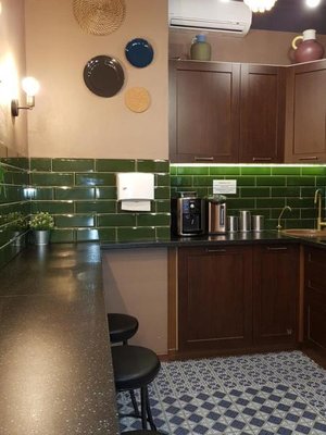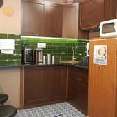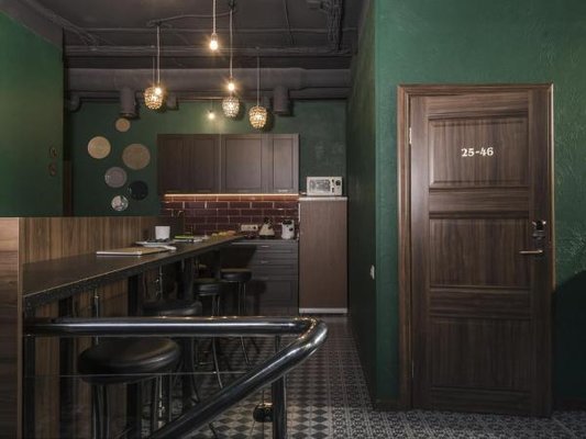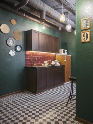 Приготовить или разогреть еду можно самостоятельно на оборудованной кухне, где имеется бытовая техника, принадлежности и посуда, кофемашина и барная стойка. Желающие могут перекусить в близлежащих кафе или ресторане.