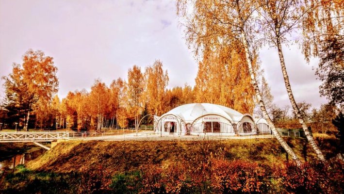 Большой шатер расположенный вдоль реки. Шатер полностью готов для крупного торжества, до 240 гостей. Его украсят по вашим желаниям и потребностям, при необходимости расставят реквизиты и декорации. В данном шатре имеется специальная зона для главных действующих лиц торжества. Идеальное место для проведения торжества, поскольку шатер расположен в отдалении от коттеджей, имеет освещение, москитные сетки.
